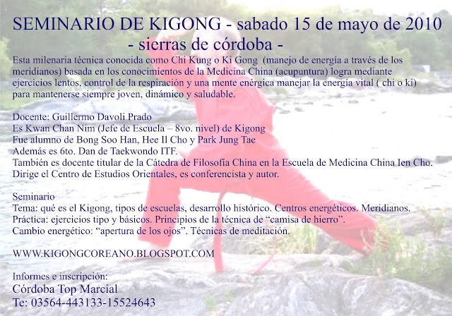 Proponemos esta actividad atendiendo a las diversas necesidades de formación tanto de artistas marciales como de personas interesadas en adquirir conocimiento de esta milenaria disciplina. Guillermo Dávoli Prado es Maestro 8º grado de Kigong y 6º Dan de Taekwon-Do ITF además de una dilatada formación académica; Córdoba Top Marcial invita a esta actividad de alto nivel en el marco del Córdoba Open Championship para el día sábado 16 de mayo de 15 hs a 18 hs. en Bialet Masse, Córdoba que se realizará al aire libre disfrutando y conectados con la naturaleza. Los interesados por favor dirigirse al mail cordobaopen@hotmail.com a los teléfonos 03564-443133 o 15524643 para informes e inscripción.